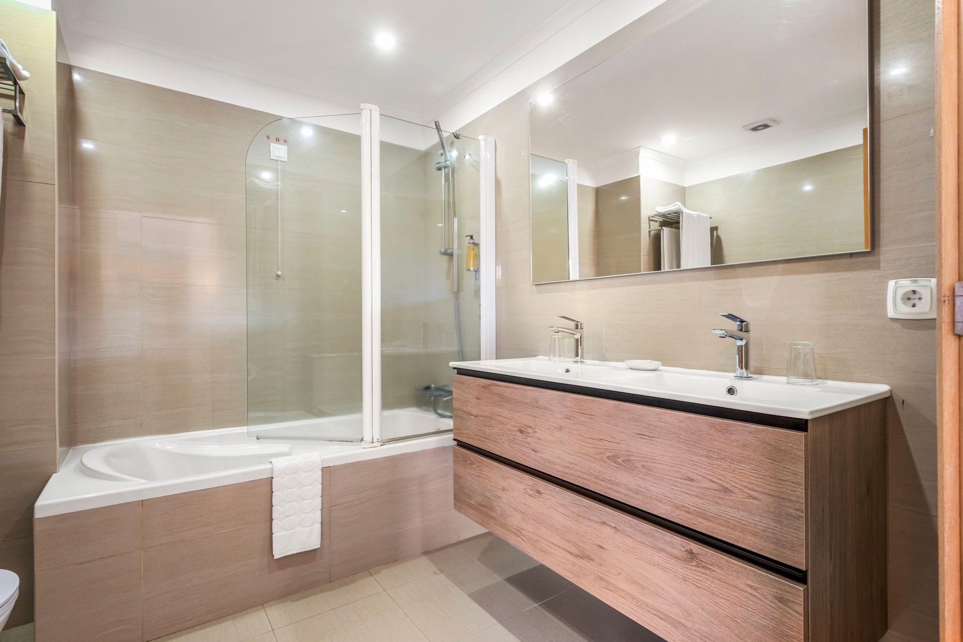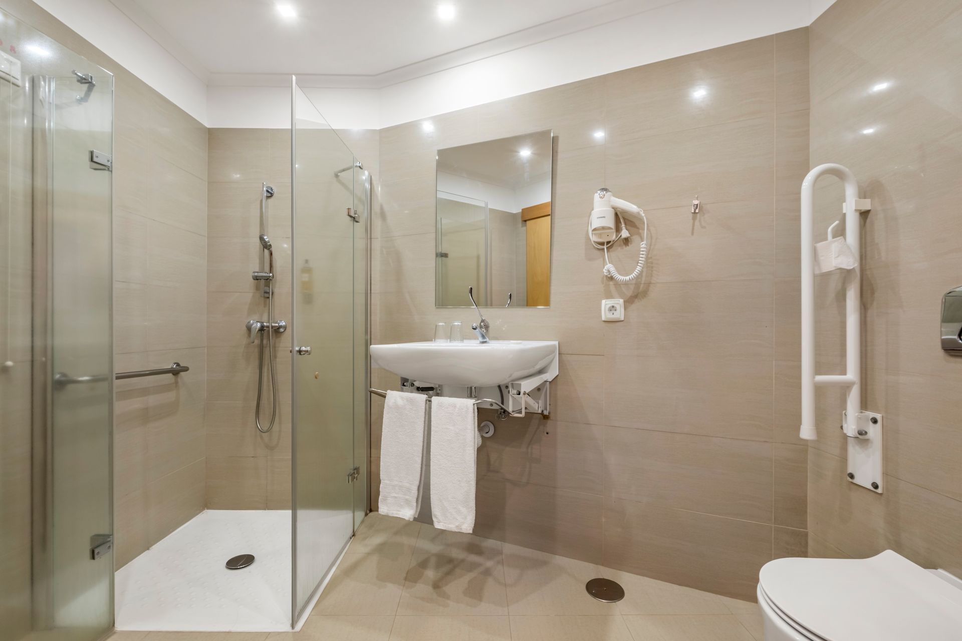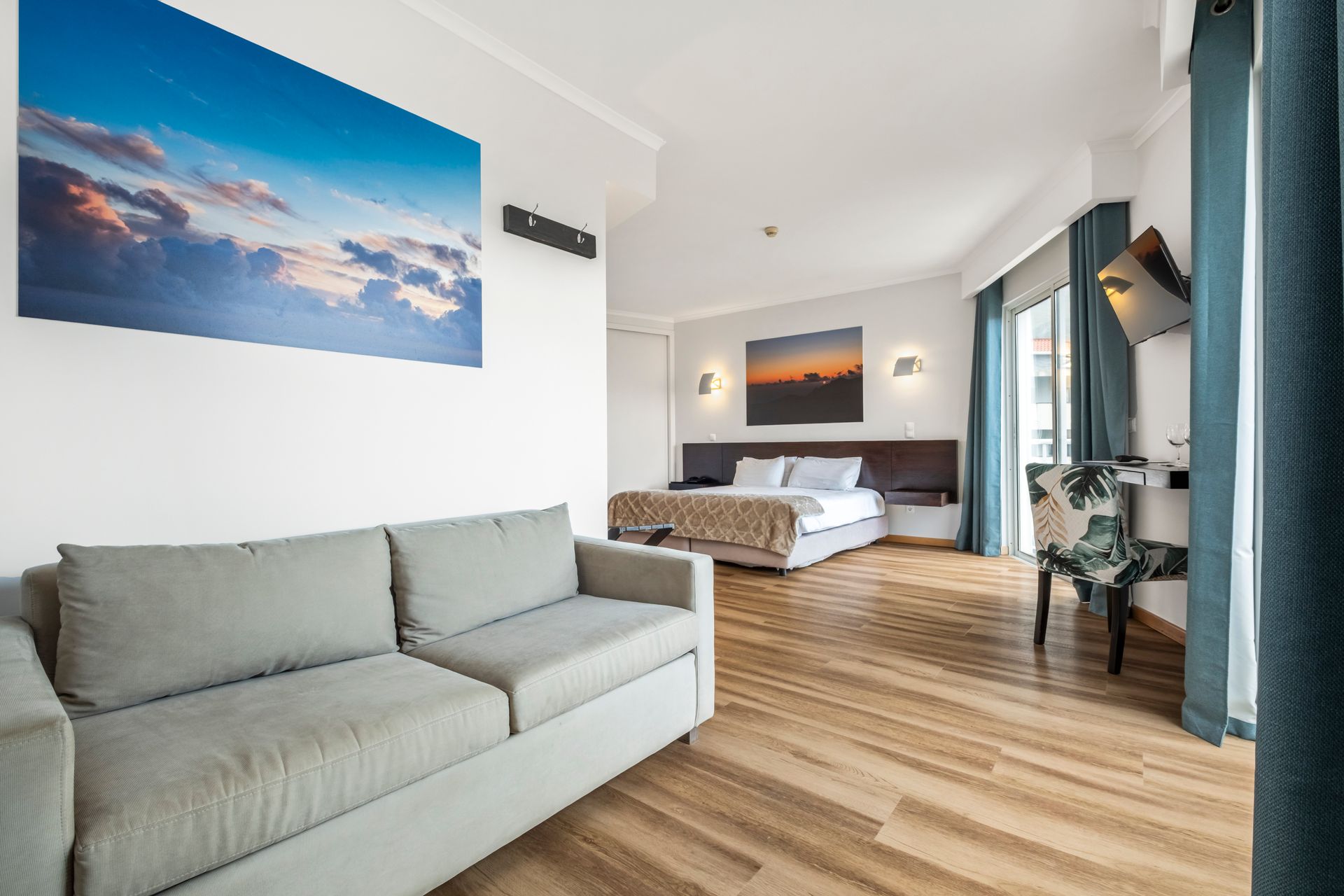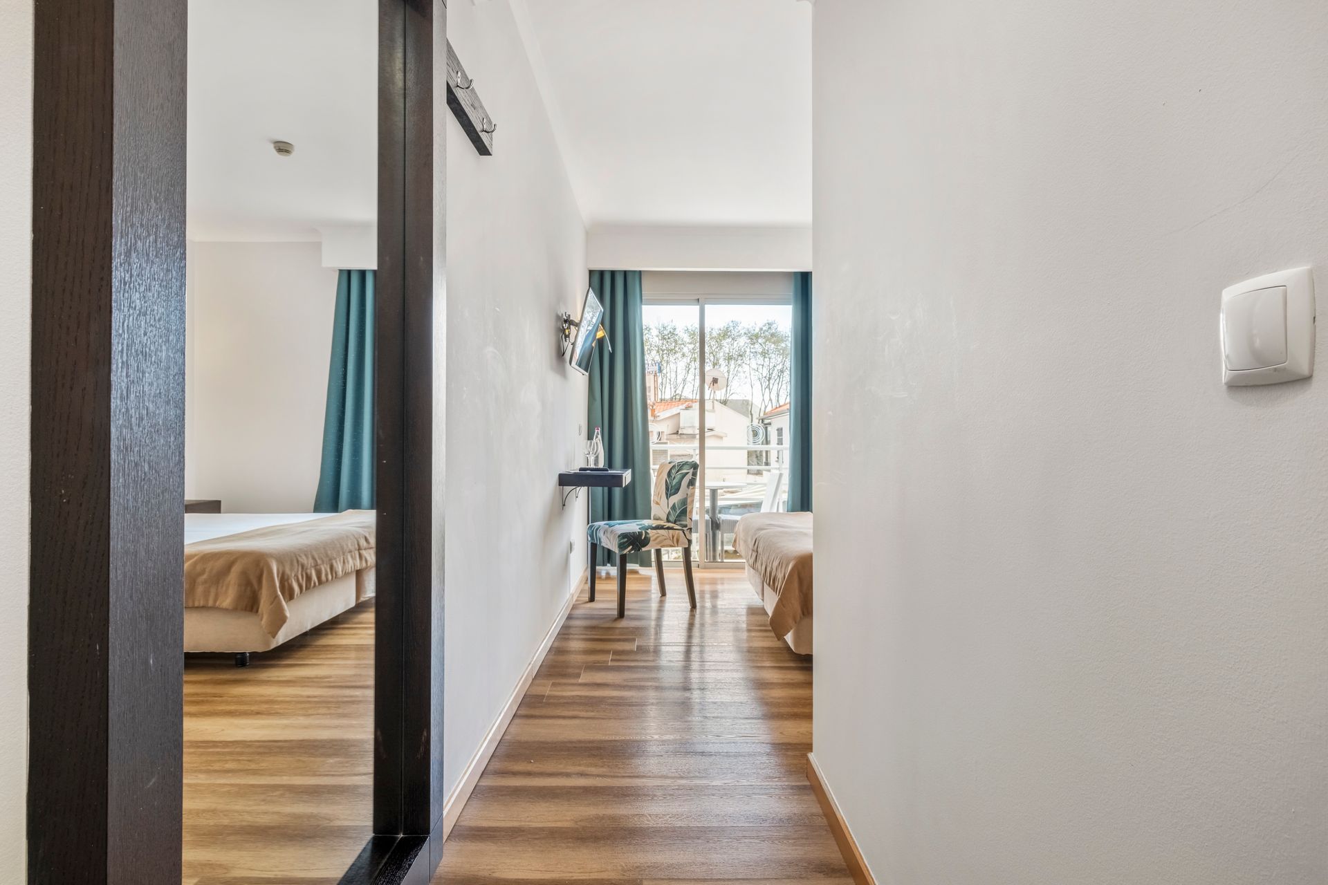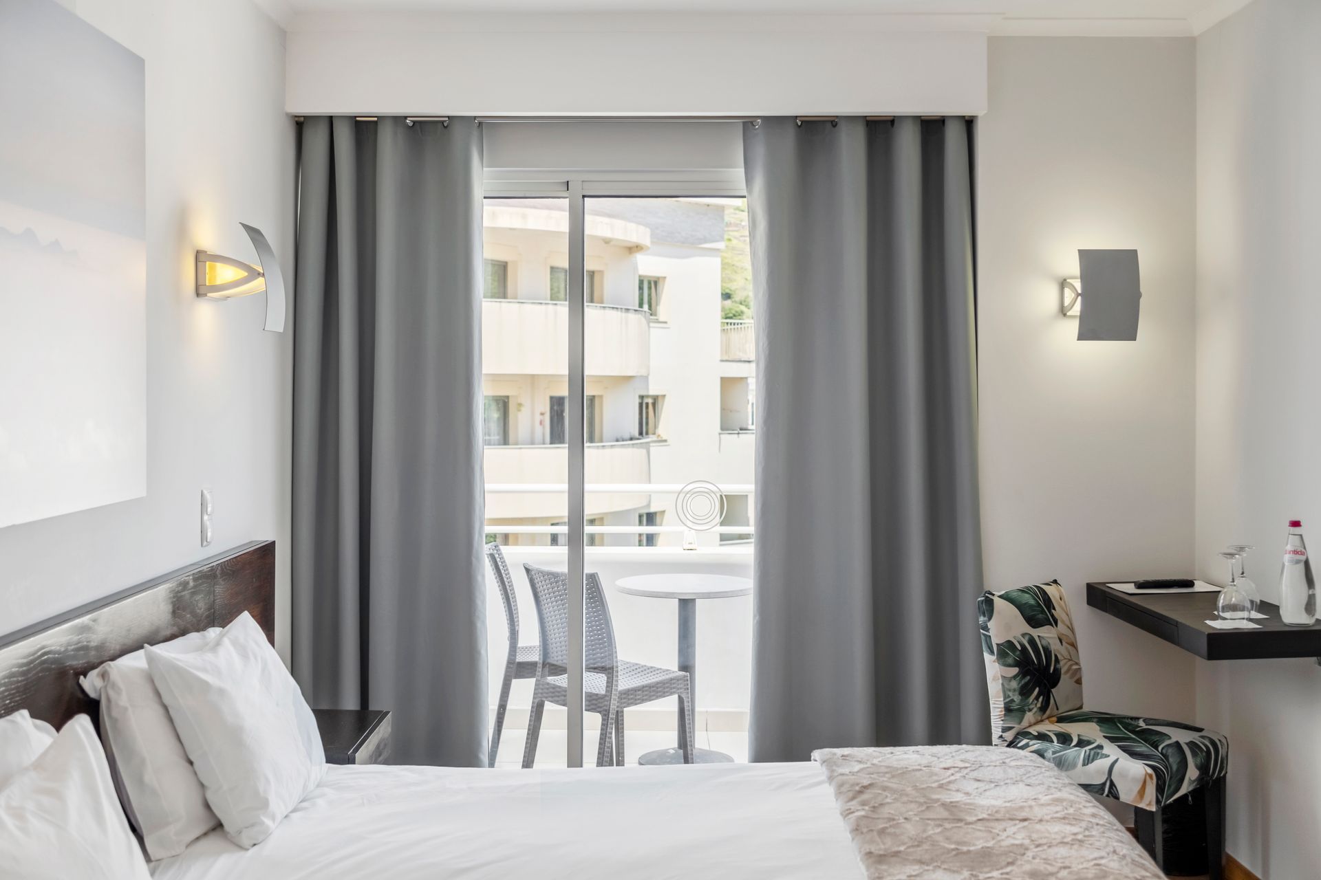 In the Superior room there is also a large bathroom with a bathtub and a small window. The room is spacious and lets in abundant natural light from the balcony window. The view from the balcony overlooks the town and the ocean.